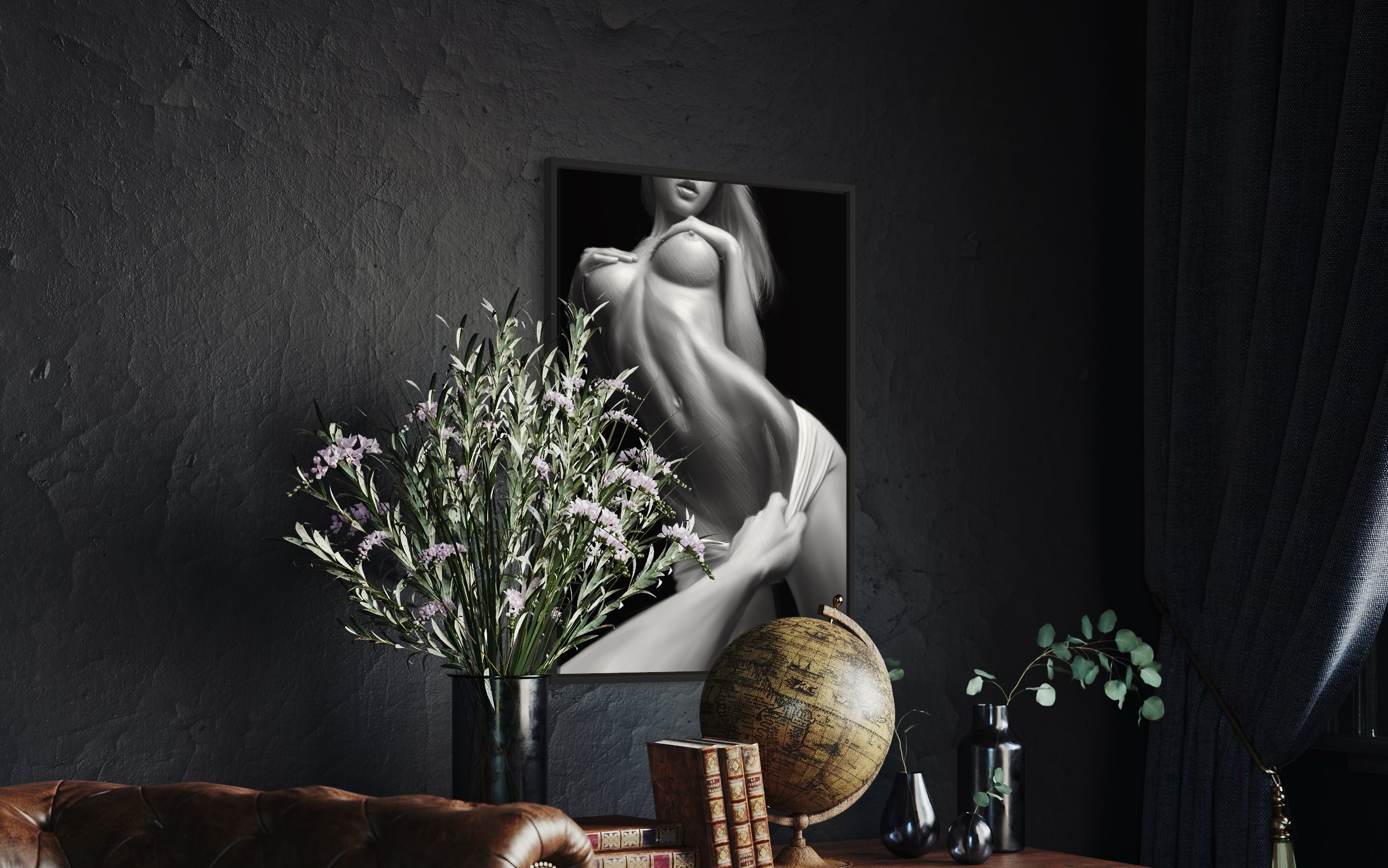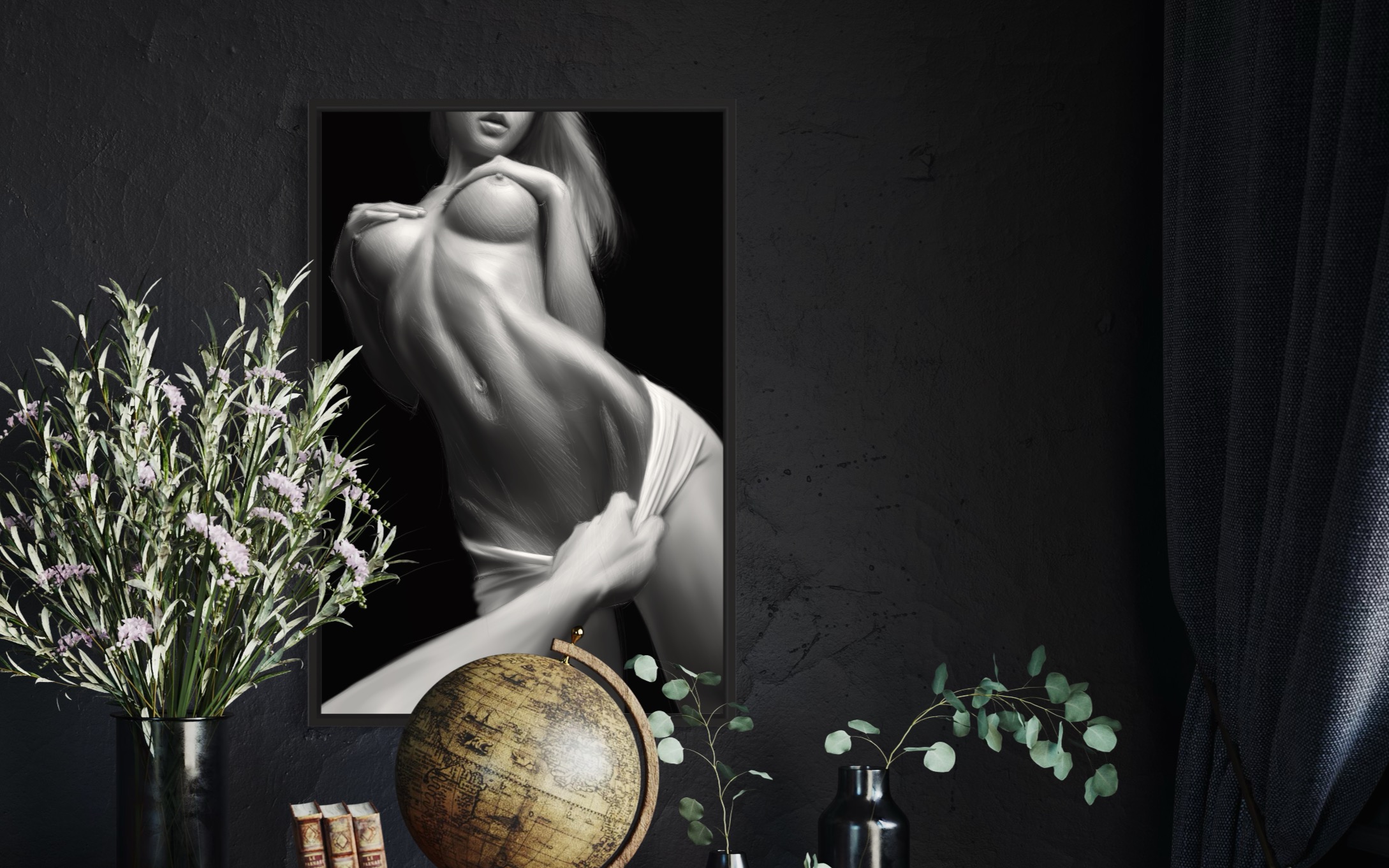 Le réalisme que vous observez est le fruit d'un travail de patience. En tant qu'artiste numérique, je travaille sur une toile vierge où chaque pore de la peau, chaque reflet et chaque fibre du drapé est peint à la main. C'est ce processus de création 100 % numérique qui permet d'obtenir une telle précision. Pour rendre justice à ces détails, j'ai choisi un support à la hauteur : une impression sur Dibon haute définition. La finition mate est cruciale ici, car elle élimine tout reflet, vous permettant de plonger dans les noirs profonds de l'œuvre. L'ensemble est magnifié par une caisse américaine en aluminium noir, offrant une profondeur et une élégance dignes d'une exposition en galerie.