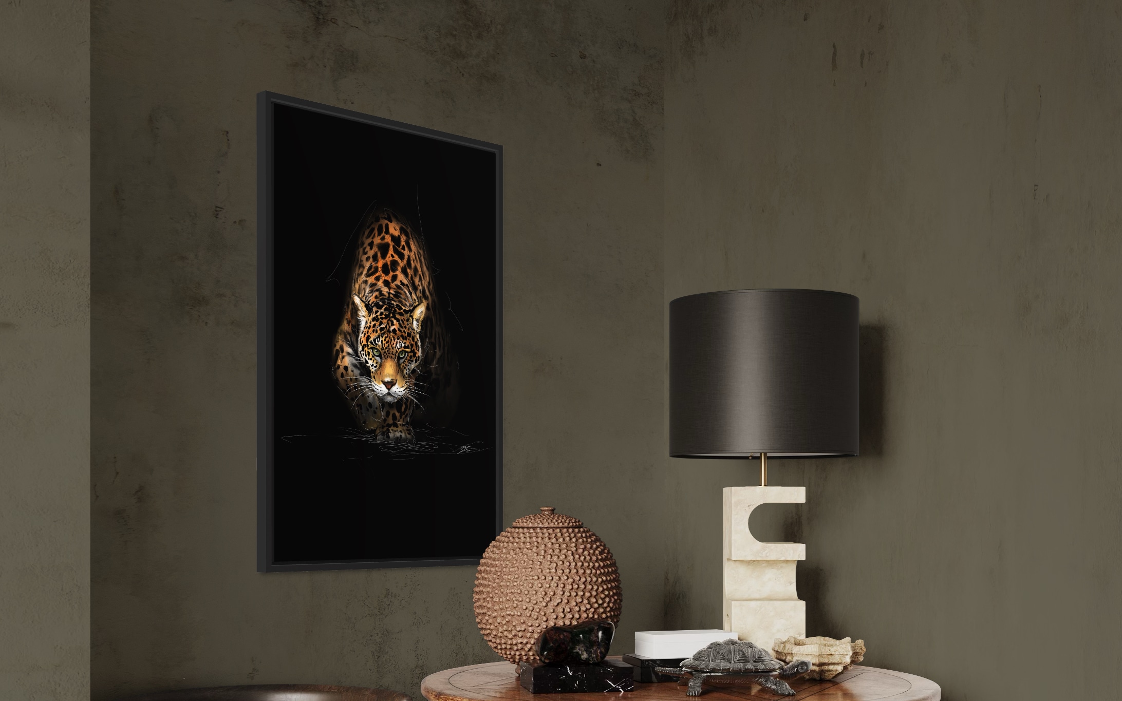 Il y a le croquis, et il y a l'œuvre finie. Cette pièce est les deux. L'œuvre "Jaguar" capture l'instant où le prédateur émerge de l'obscurité. Seuls son regard vert perçant et les rosettes de son pelage sont touchés par la lumière, tandis que le reste de son corps se fond dans les traits de croquis bruts. C'est une fusion de puissance brute et de technique visible, un prédateur en pleine chasse qui vous fixe droit dans les yeux.
