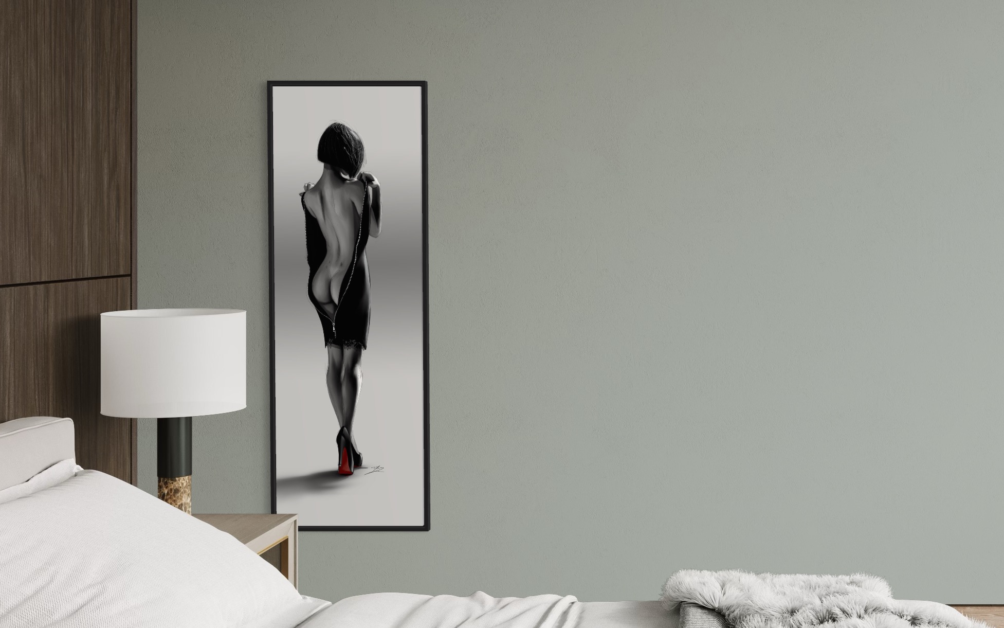 Le Processus : Peinture Numérique Artisanale Comme pour le reste de la collection, l'émotion qui se dégage de ce tableau vient de la main de l'artiste. Réalisé sur iPad Pro via Procreate, le travail des ombres sur le dos et le rendu satiné de la robe ne sont pas des filtres automatiques, mais le fruit d'heures de peinture digitale. On ressent le grain, la touche et l'intention humaine derrière chaque nuance de gris.