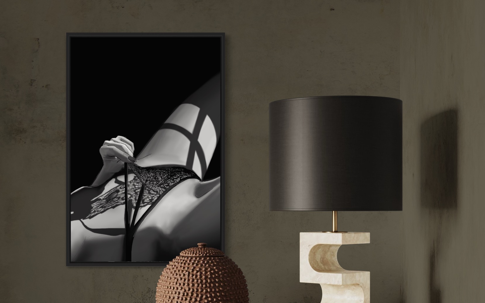 Pour ce troisième opus de la série, j'ai voulu capturer l'instant où la lumière extérieure s'invite dans la chambre pour transformer le corps en une œuvre géométrique. Shadow 3 est une peinture de contrastes : l'ombre rigide d'une croisée de fenêtre vient s'écraser sur la douceur des courbes féminines. Ce qui me fascine ici, c'est la tension entre cette structure imposée par l'ombre et la délicatesse extrême de la dentelle que l'on soulève, révélant un détail de peau presque vibrant.