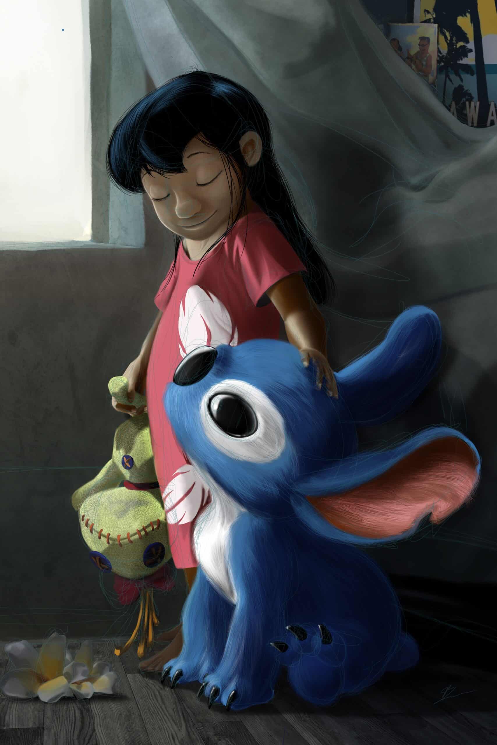 Ah, "Ohana" ! Ce mot résume à lui seul toute l'intention de cette œuvre. J'ai voulu capturer ce moment de pure tendresse, ce lien indéfectible qui unit Lilo et Stitch. La lumière douce qui filtre par la fenêtre, Lilo, les yeux fermés, qui tient fermement sa poupée Vaudou (Scrump) tout en caressant son meilleur ami... et Stitch, qui lève les yeux vers elle avec une confiance et une adoration absolues. C'est un moment suspendu, le calme après la tempête, qui définit leur famille si particulière.