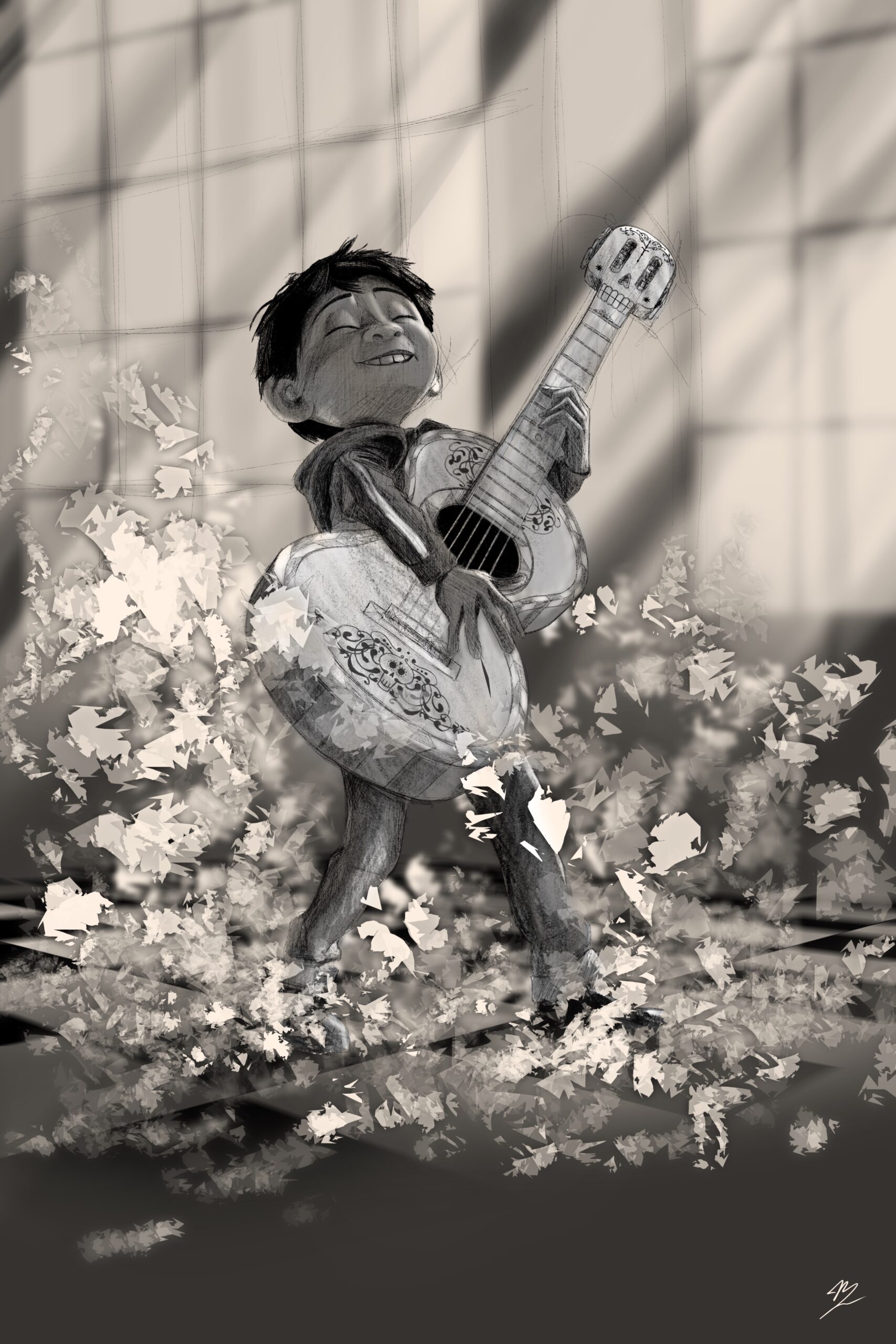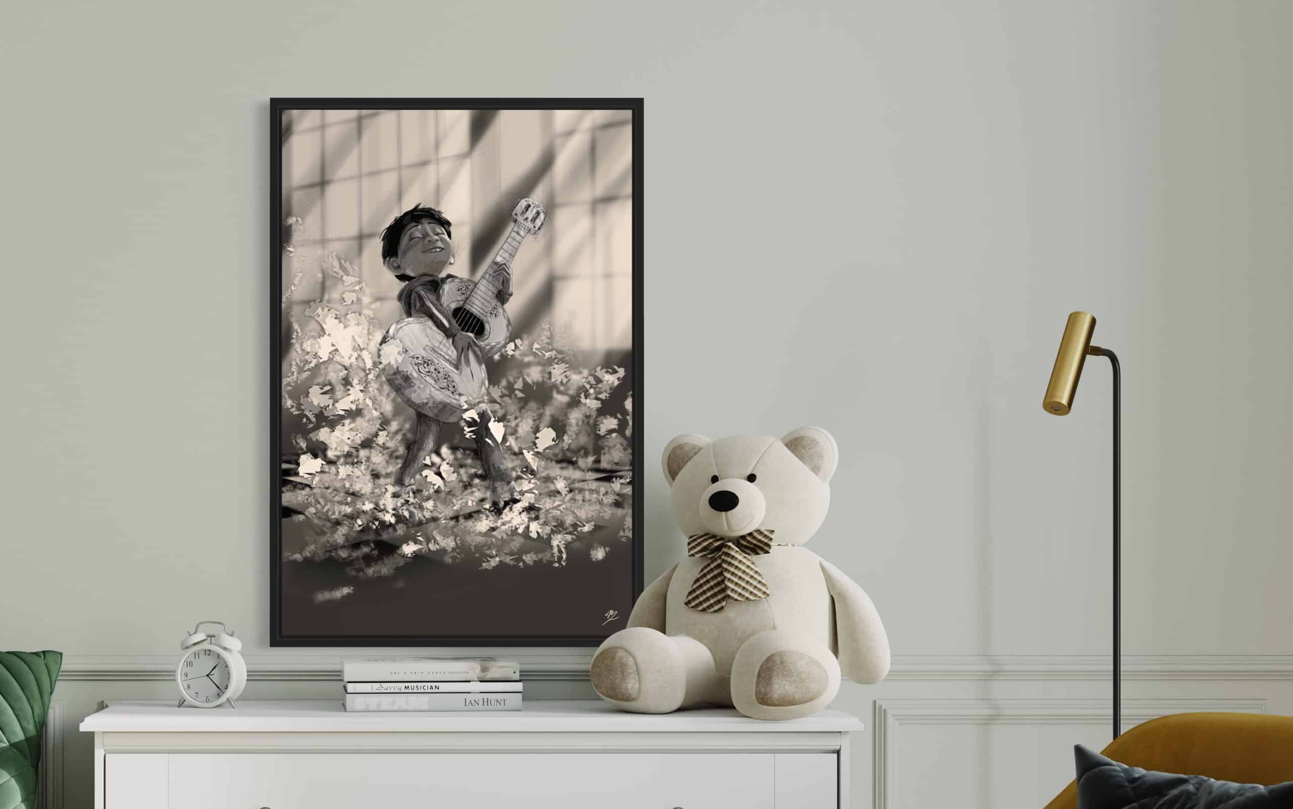 Cette œuvre, c'est l'instant précis où la musique prend le dessus. J'ai voulu capturer l'extase de Miguel, ce moment où il est "Un Poco Loco", les yeux fermés, vivant pleinement sa passion. La guitare iconique brille, et il est entouré par ce tourbillon magique de pétales de cempasúchil. C'est une scène baignée de lumière, un contre-jour puissant qui, pour moi, symbolise la connexion entre le monde des vivants et celui de ses ancêtres musiciens.