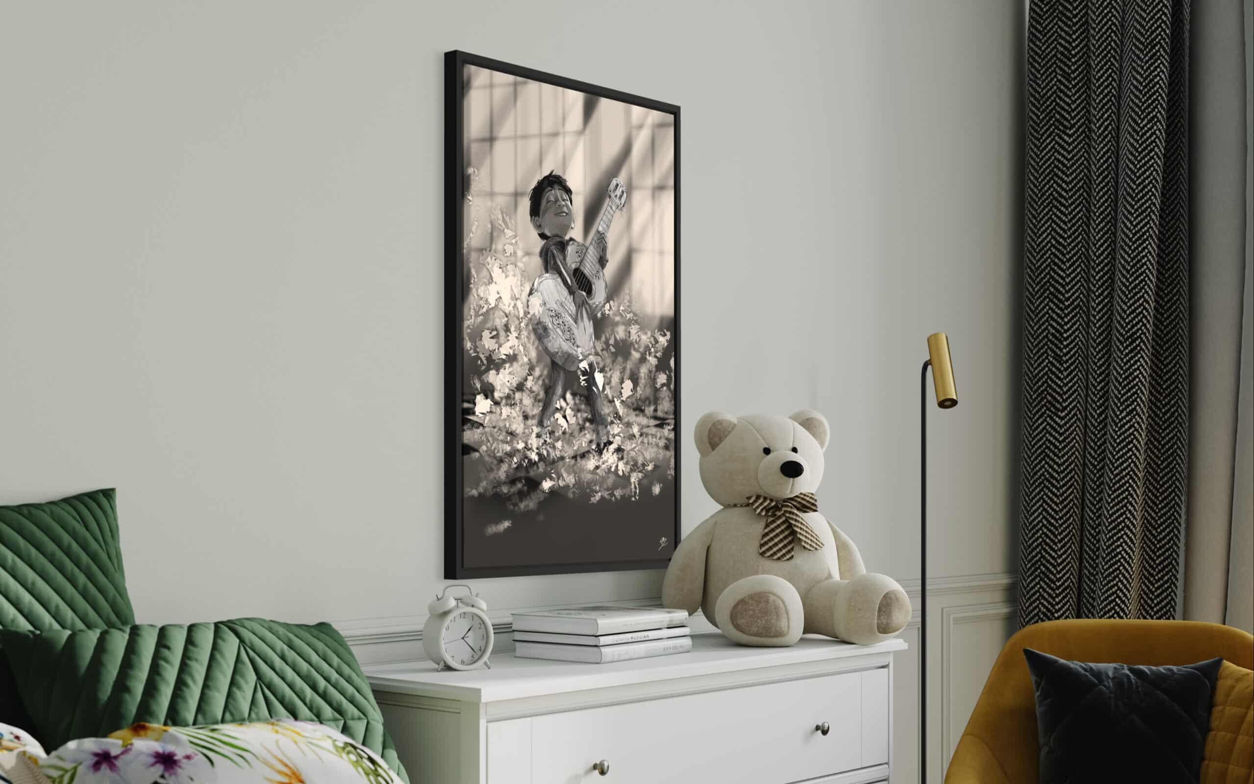 Contrairement à la série des croquis, cette pièce est une peinture numérique complète. Je suis parti d'une page blanche pour sculpter la lumière, un vrai défi technique pour gérer ce contre-jour intense. Chaque pétale, chaque détail de la guitare, chaque ombre sur le visage de Miguel a été méticuleusement travaillé pour obtenir ce réalisme. Pour une œuvre avec de tels contrastes, l'impression sur Dibon haute définition est parfaite : sa finition mate anti-reflets est cruciale. Elle absorbe la lumière ambiante, préserve la profondeur des noirs et la brillance des pétales sans jamais être gâchée par les reflets. La caisse américaine en aluminium noir vient parfaire l'ensemble pour une finition galerie.